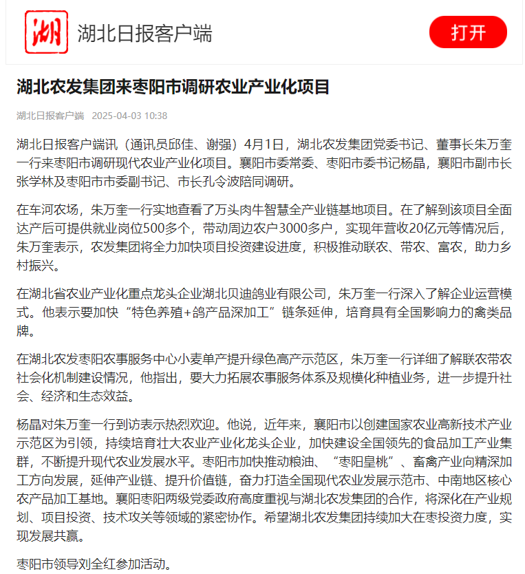 湖北日報:湖北農發集團來棗陽市調研農業產業化項目
